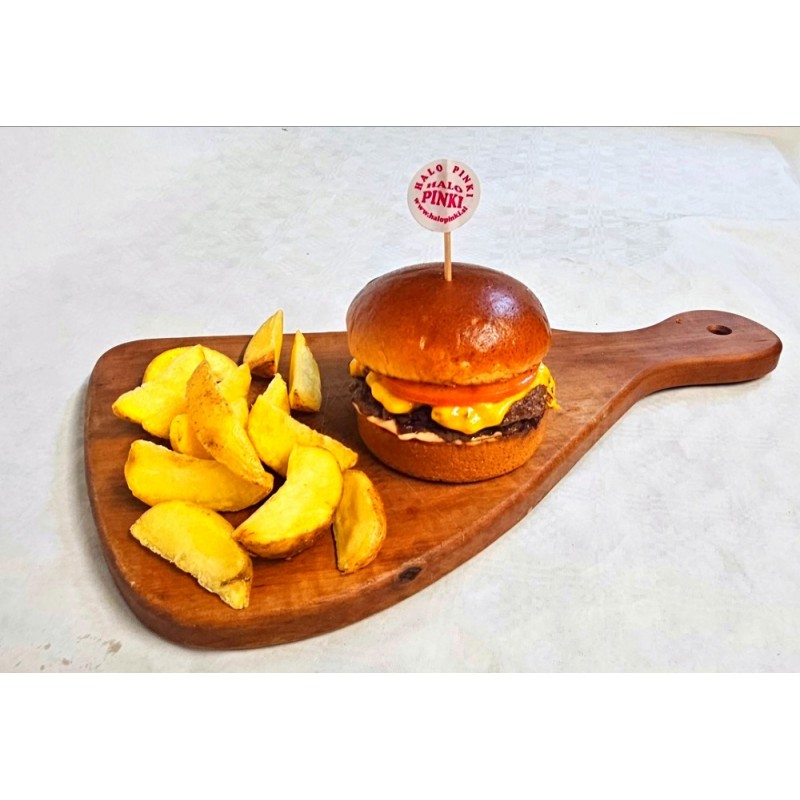12,5bun, beef patty, fried cheese. lettuce, tomato, signature big pinki mix sauce