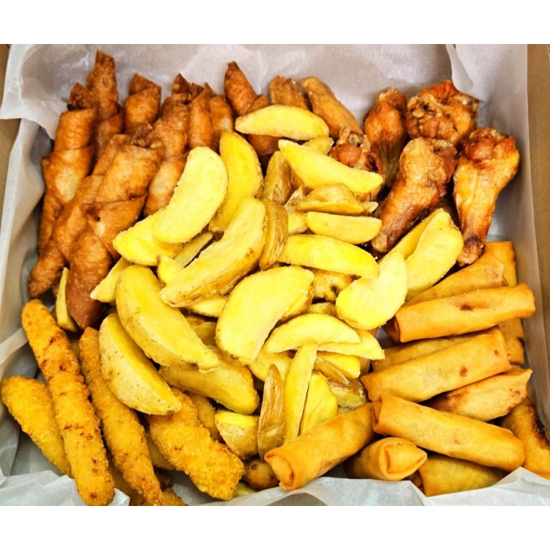 10 kom taquitos z bučkami in papriko 10 kom kitajski zelenjavni zvitki 6 kom sir za žar, 6 kom sir ocvrti 1 porcija pečena zelenjava 1 porcija krompirjevi krhlji 1 kom tatarska omaka v lončku (100g) 2 kom nacho sir v lončku (50g) 1 kom salsa v lončku (50G)