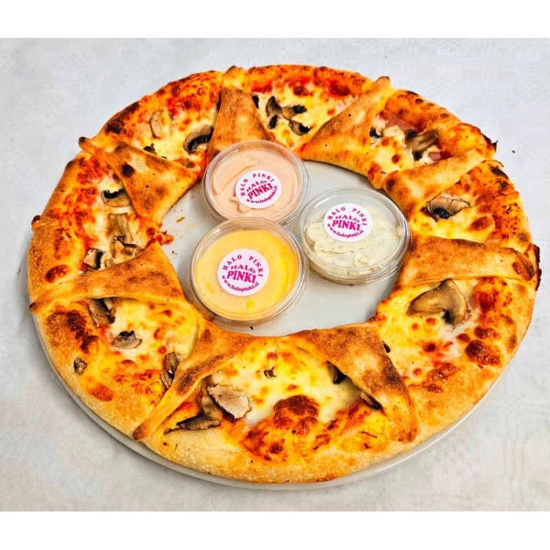 pelati z origanom, šunka, sir, gobe ( tris omak: domača, nacho, tatrska)