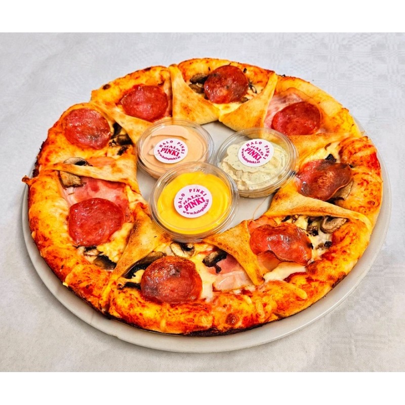 pelati z origanom, šunka, sir, gobe ( tris omak: domača, nacho, tatrska)